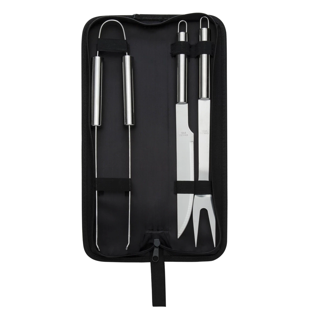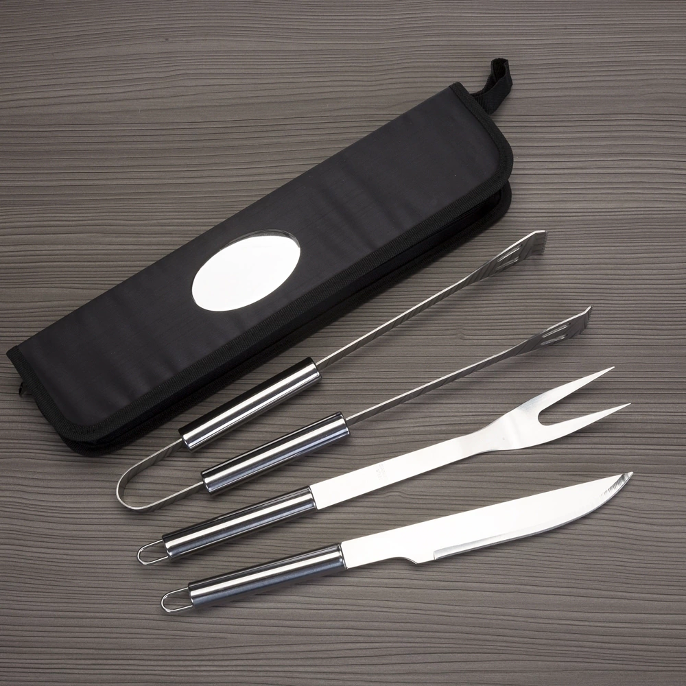 Kit churrasco 3 peças em estojo de nylon com alça. Possui: faca(acompanha proteção plástica), garfo(acompanha proteção plástica), pegador em inox e parte interna com velcro para guardar as peças. Acompanha plaqueta para gravação.